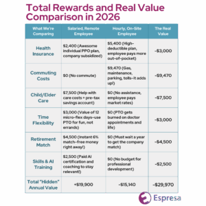 In 2026, pay equity is no longer enough. An on-site salaried worker earning $65,000 is effectively “poorer” than a remote worker earning $50,000 once you factor in the massive financial drain of commuting, healthcare premiums, and lost time.